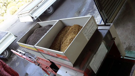 発芽を促しておいた種籾(浸種・催芽)を、床土を敷き詰めておいたトレーへ均一にまいていきます。といっても、実際にまく作業と上から土をかける作業は、昭和生まれの種まき機が頑張ってくれる。
